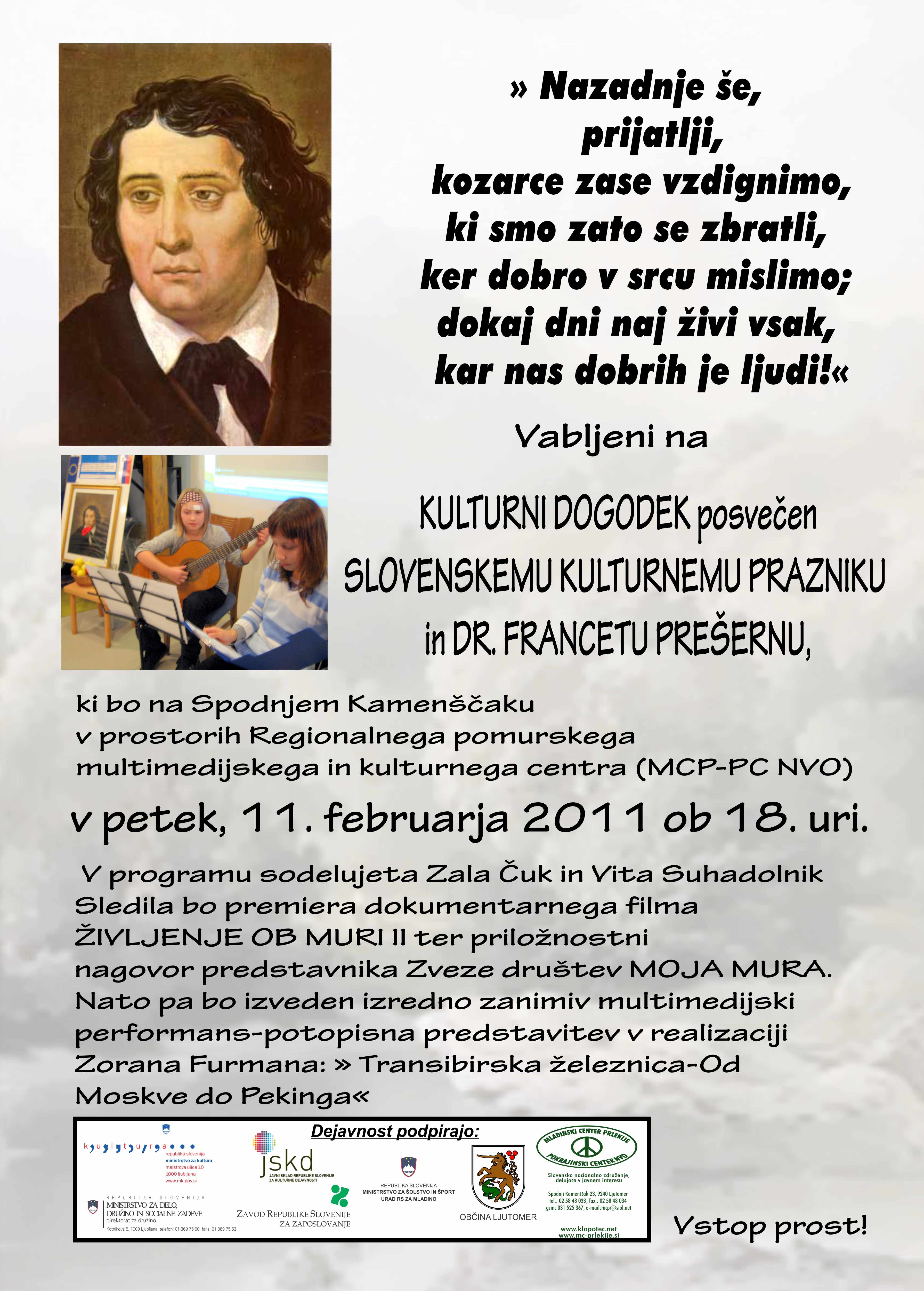 Vabljeni na KULTURNI DOGODEK posvečen SLOVENSKEMU KULTURNEMU PRAZNIKU in DR. FRANCETU PREŠERNU, ki bo na Spodnjem Kamenščaku v prostorih Regionalnega pomurskega multimedijskega in kulturnega centra (MCP-PC NVO) v petek, 11. februarja 2011 ob 18. uri. V programu sodelujeta Zala Čuk in Vita Suhadolnik