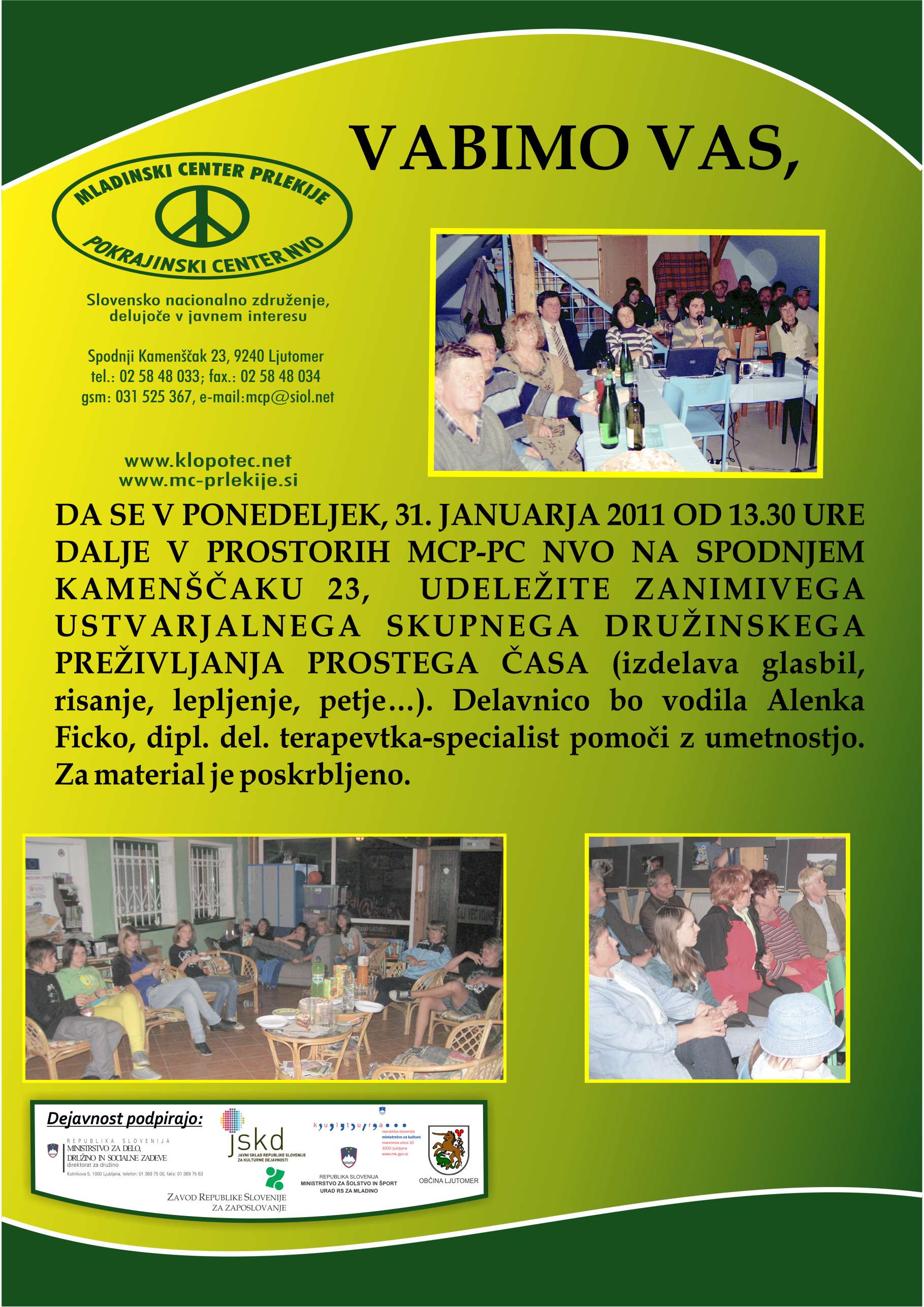 Mladinski center Prlekije - pomurski pokrajinski center nevladnih organizacij vas vabi v ponedeljek 31. januarja v prostore centra na Kamenščak 23 od 13.30 ure dalje na zanimivo ustvarjalno skupno družinsko preživljanje prostega časa, ki bo vsebovalo izdelavo glasbil, leplenje, petje...