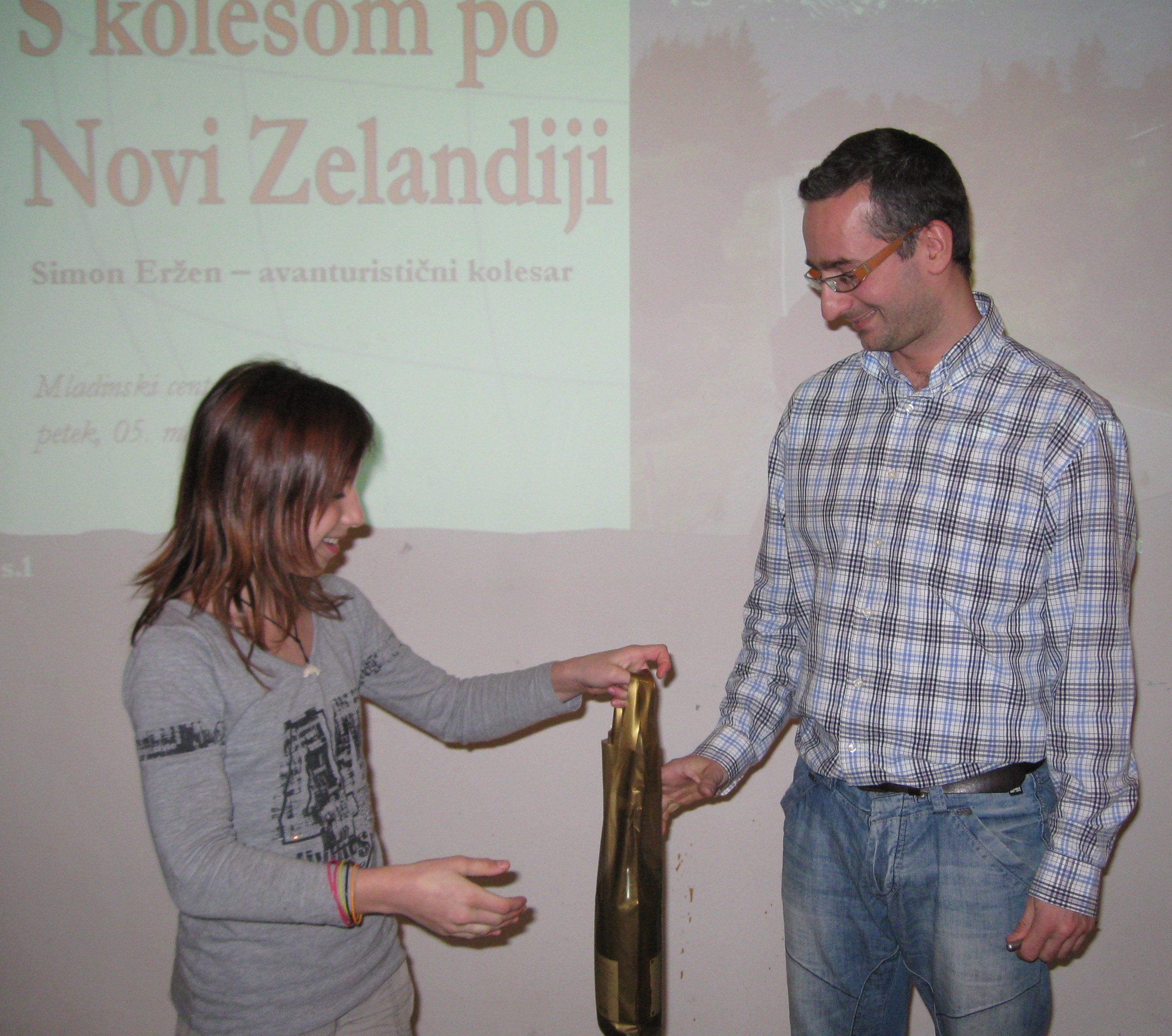 Komaj na petkovi predstavitvi smo izvedeli,da ima strasten in uspešen avanturistični kolesar in performer SIMON ERŽEN, ki domuje v Mariboru sorodnike tudi v Prlekiji. Novembra 2008 leta se je odločil za drzni in osupljivi podvig in sicer da bo prekolesaril cel svet. Sporočilo projekta S KOLESOM OKOLI SVETA je ITI PREKO VSEH MEJA. Nova Zelandija je zavzela častno prvo mesto in jo je tako zavzeti kolesar obiskal in prekolesaril najprej. Poln še svežih spominov nam jo je slikovito