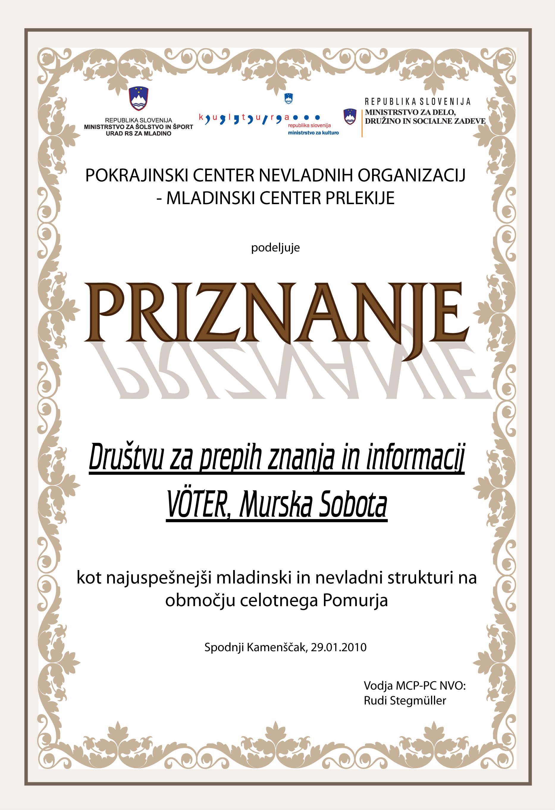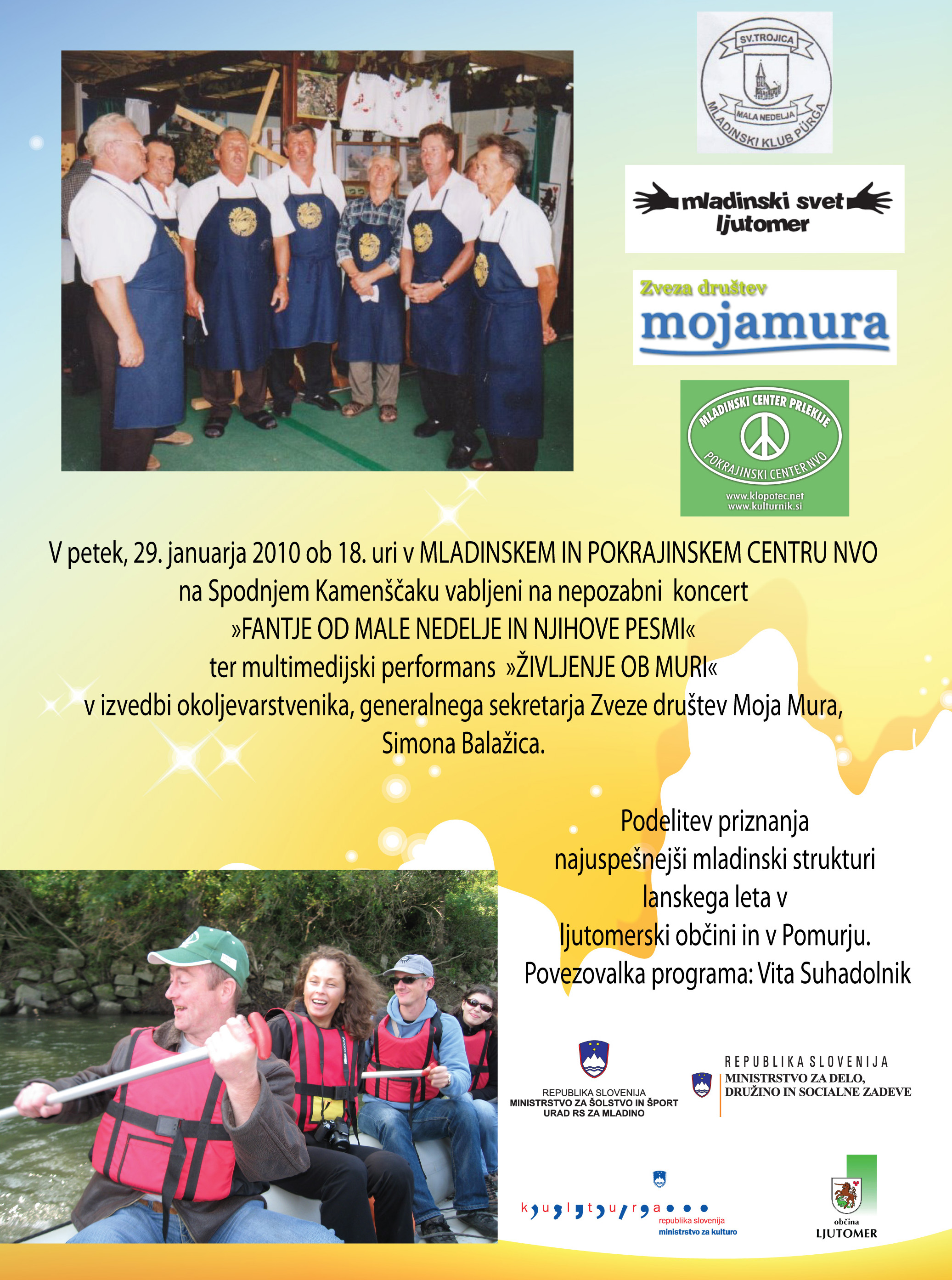 V petek, 29. januarja 2010 ob 18. uri v MLADINSKEM IN POKRAJINSKEM CENTRU NVO na Spodnjem Kamenščaku vabljeni na nepozabni KONCERT FANTOV OD MALE NEDELJE ter multimedijski performans ŽIVLJENJE OB MURI v izvedbi okoljevarstvenika, generalnega sekretarja Zveze društev Moja Mura, Simona Balažica. Podelitev priznanja najuspešnejši mladinski strukturi lanskega leta v ljutomerski občini in v Pomurju. Povezovalka programa Vita Suhadolnik