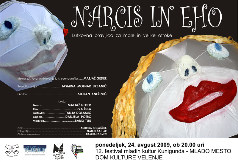 Lutkovna pravljica za male in velike otroke NARCIS IN EHO, avtorski projekt skupine umetnikov KD Ars Altera Pars, gostuje na Poletju v Moravskih Toplicah, v soboto, 22. avgusta 2009, ob 20.00 uri v Športnem parku TERME 3000,