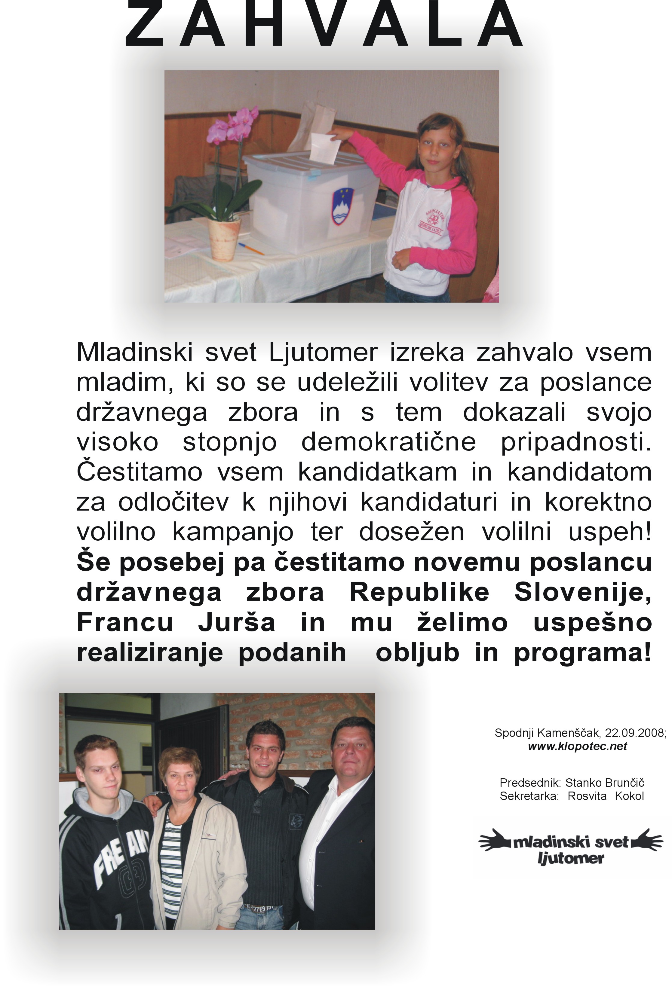 Še posebej pa čestitamo novemu poslancu državnega zbora Republike Slovenije, Francu Jurša in mu želimo uspešno realiziranje podanih