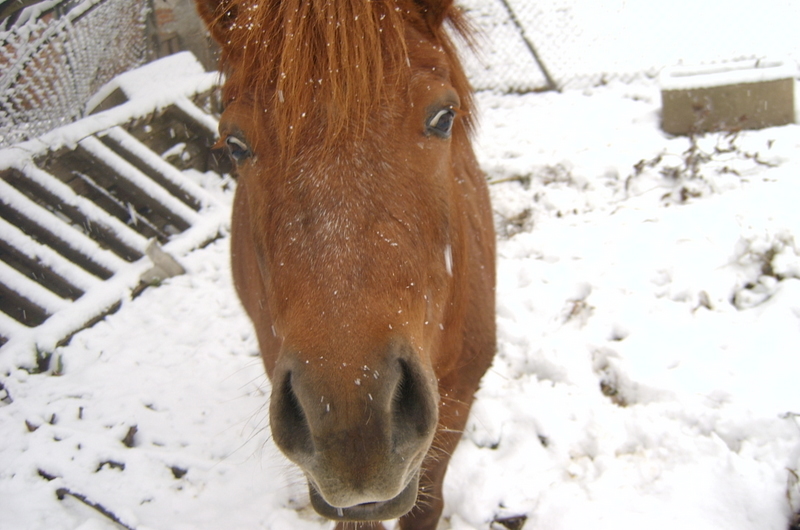 Na fotografiji : Začudenje ob izstopu iz hleva, vse je belo,belo...Mikasfen,prijeten konjiček, ki domuje v sklopu otroško-mladinske eko kmetije MCP se čudi.