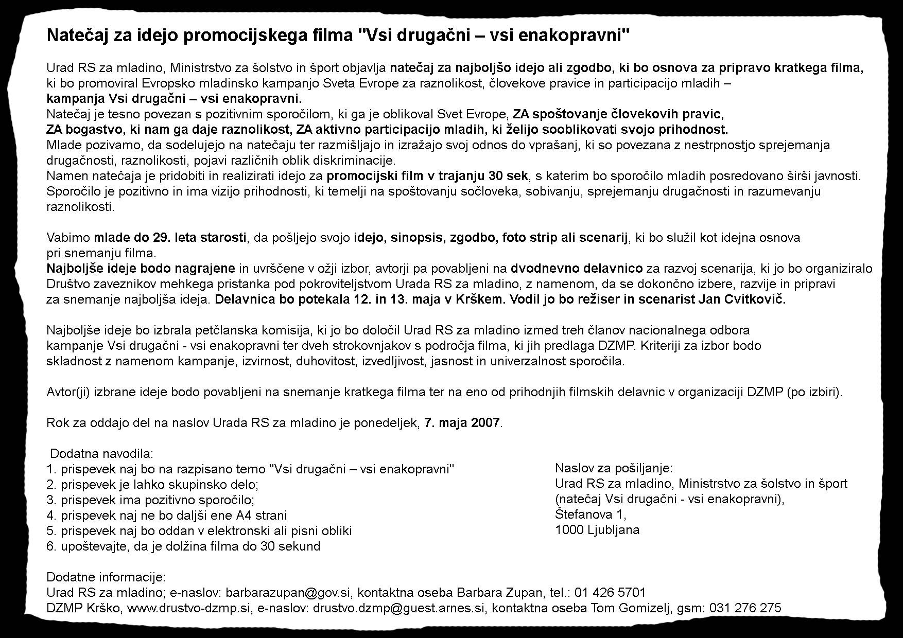 NATEČAJ ZA FILM VSI DRUGAČNI - VSI ENAKOPRAVNI !