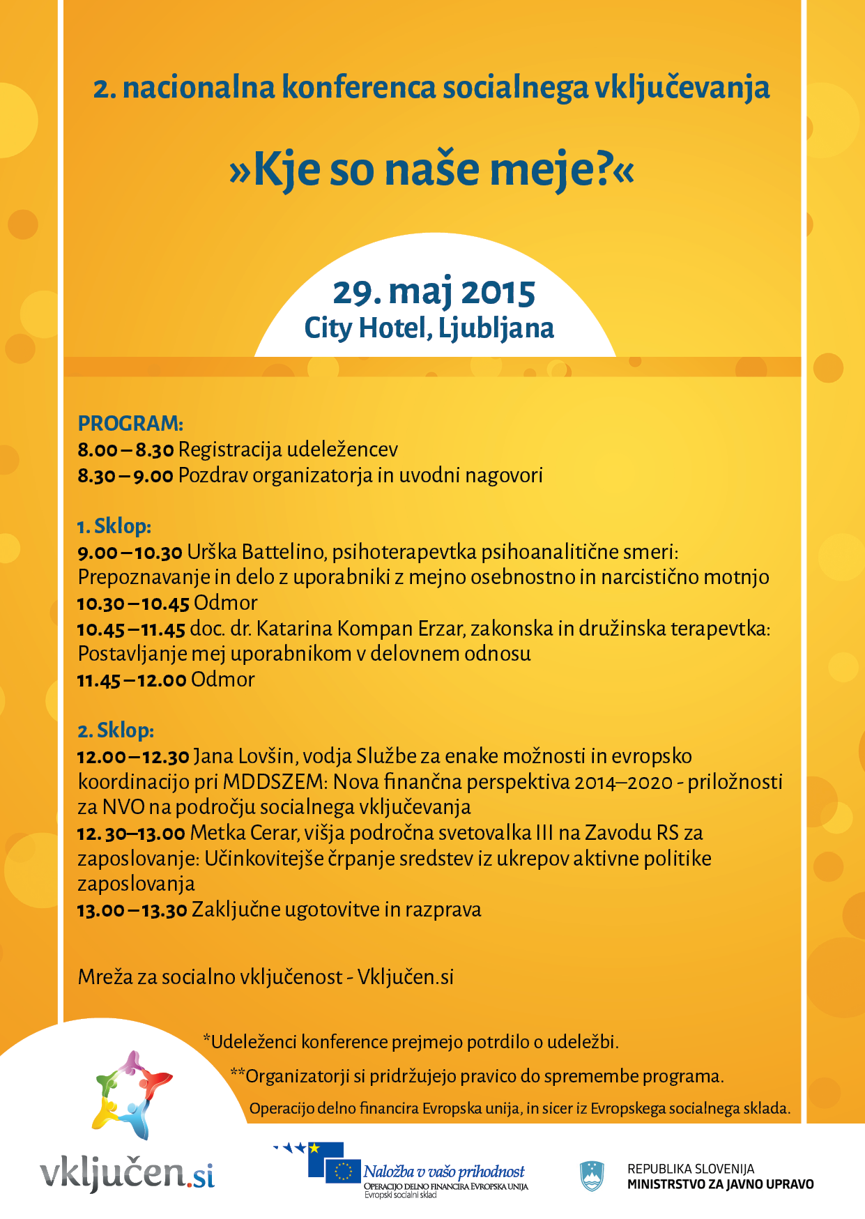 Sporočamo vam, da v petek, 29. maja 2015 organiziramo 2. Nacionalno konferenco socialnega vključevanja: "Kje so naše meje?", ki bo potekala v City Hotelu v Ljubljani.