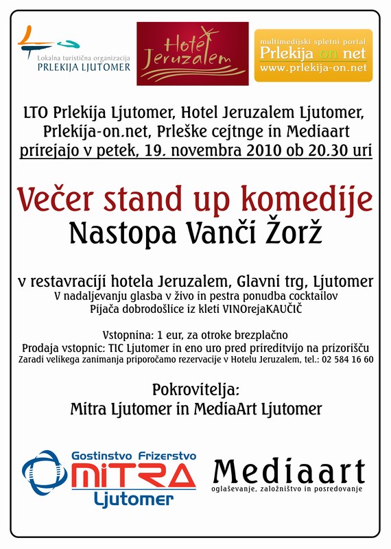 19. 11. 2010: ob 20. 30 uri, Hotel Jeruzalem, STAND UP predstava - VANČI ŽORŽ, LTO Prlekija Ljutomer, 02 584 83 33,