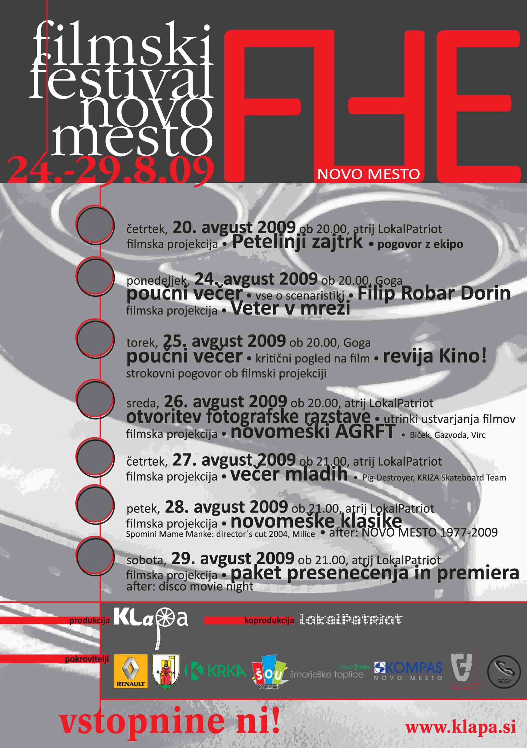 Društvo ljubiteljev filma Klapa Vas vabi na prvi filmski festival v Novem mestu, ki je letos posvečen novomeškemu filmskemu ustvarjanju. Vsa dogajanja v sklopu