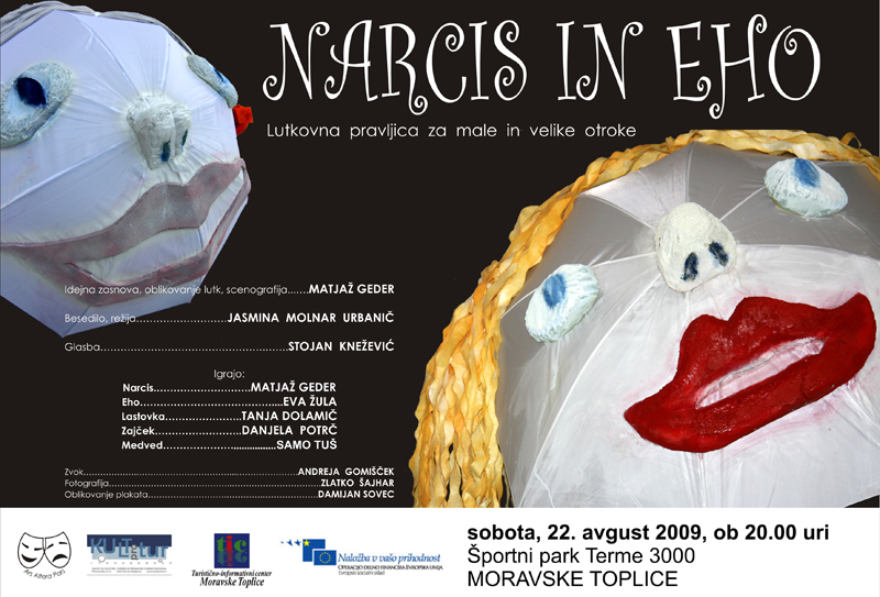 Lutkovna pravljica za male in velike otroke NARCIS IN EHO, avtorski projekt skupine umetnikov KD Ars Altera Pars, gostuje na Poletju v Moravskih Toplicah, v soboto, 22. avgusta 2009, ob 20.00 uri v Športnem parku TERME 3000,
