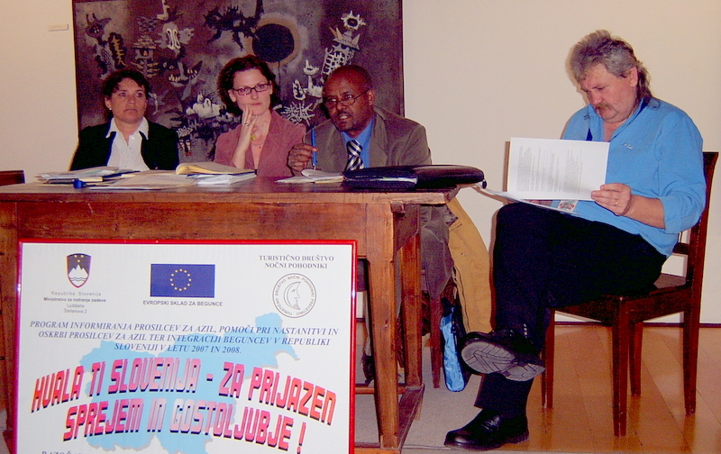 Foto utrip z nedavne tribune o integraciji beguncev v Republiki Sloveniji, ki je potekala v Škofji Loki v organizaciji Turističnega društva Nočni pohodniki, Precetinci. S svojim izlaganjem sta prijetno presenetili in z odobravanjem prisotnih je bilo več njunih predlogov tudi sprejetih, ga. Lučka Žižek direktorica Območne kranjske službe Zavoda RS za zaposlovanje ( tudi članica usmerjevalne skupine projekta PROMO - promocija