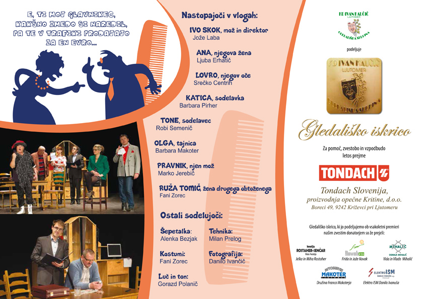 08. 04. 2015: ob 19. 30. uri, Dom kulture Ljutomer, GLAVNIK - komedija, KD Ivan Kaučič Ljutomer – gledališka skupina, predprodaja vstopnic TIC Ljutomer,